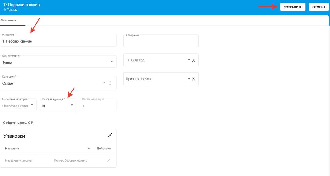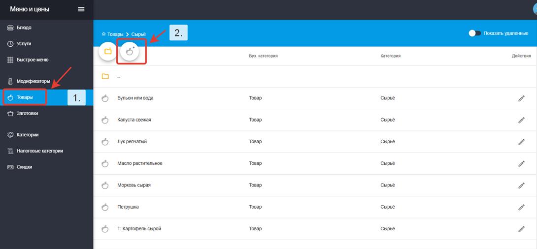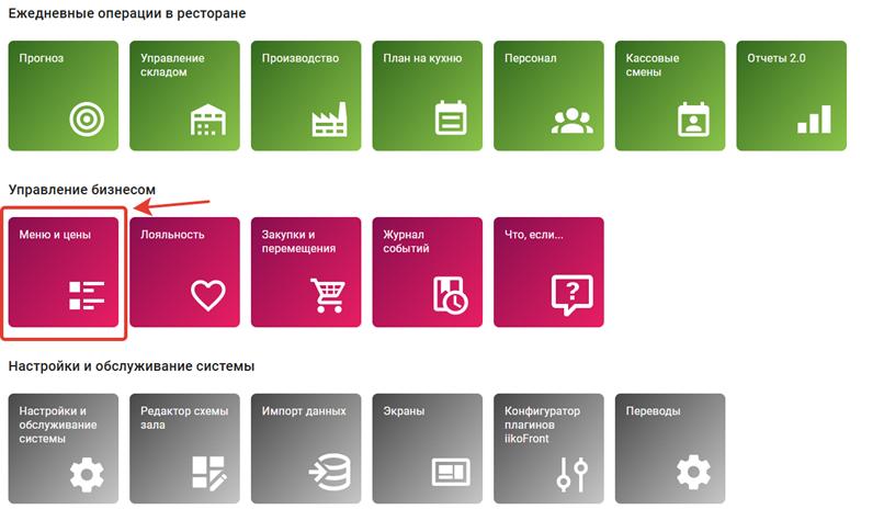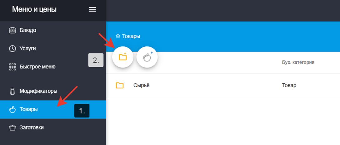Работа по заведению товаров и блюд проходит в разделе Управление бизнесом >> Меню и цены.