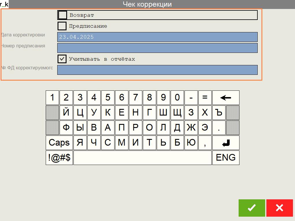 В открывшейся форме чека коррекции заполните необходимые поля: