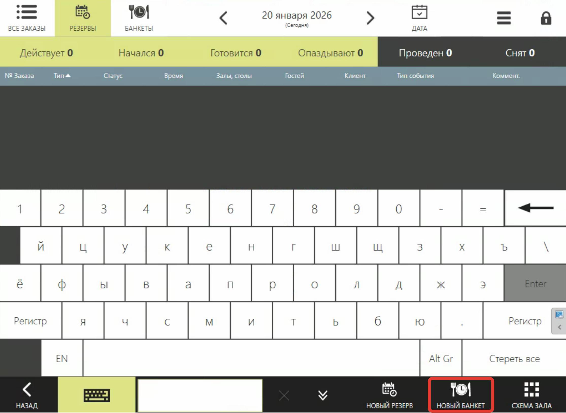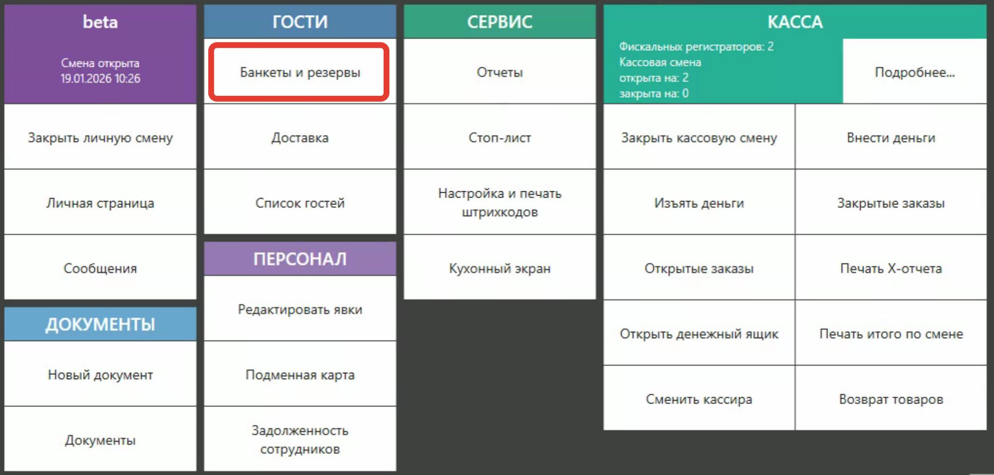 Откройте Главное меню и перейдите в раздел Банкеты и резервы.