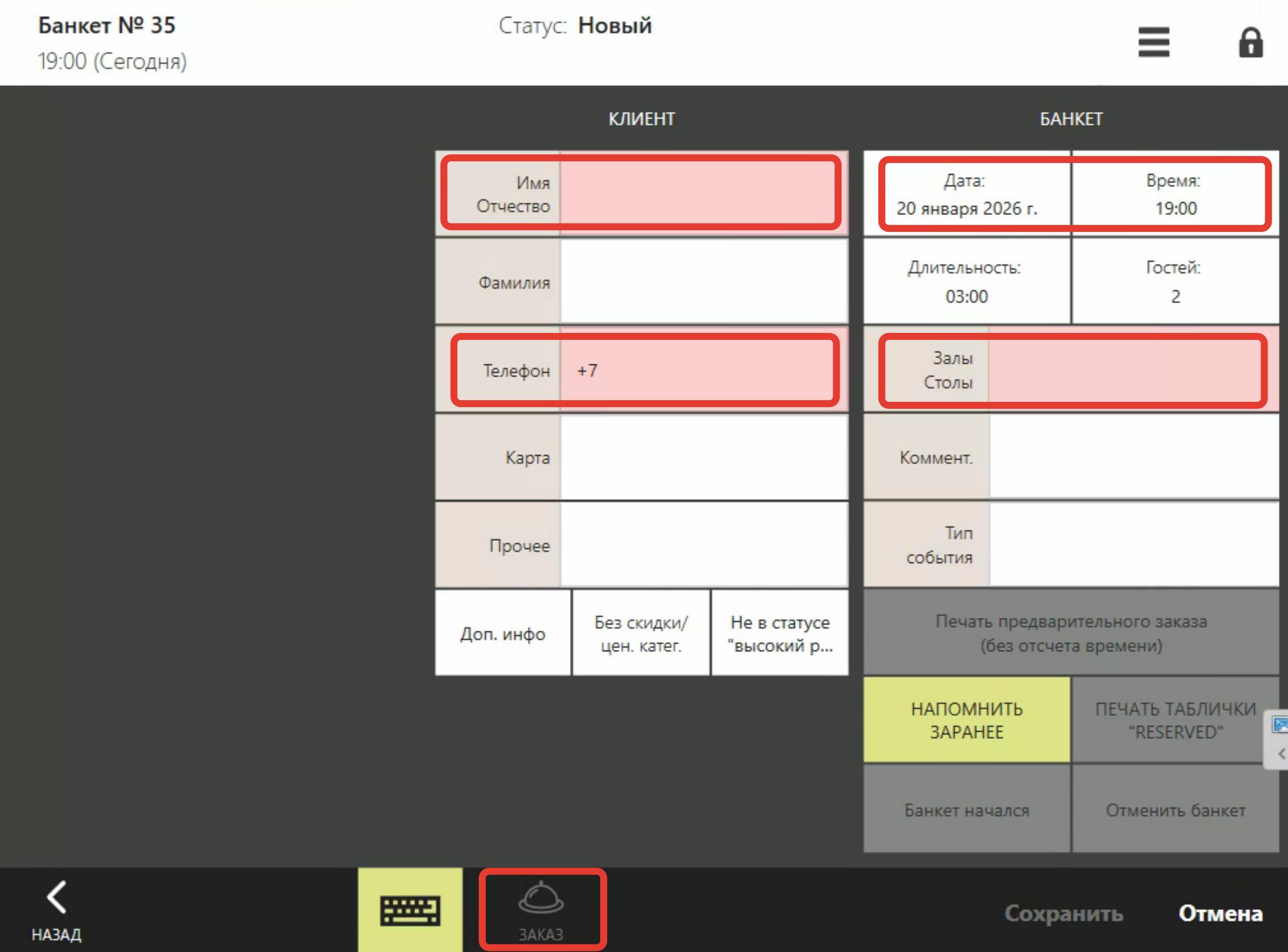 Заполните карточку мероприятия: укажите ФИО, номер телефона гостя. Обязательно проставьте дату и время начала банкета. Присвойте заказу нужный Стол.