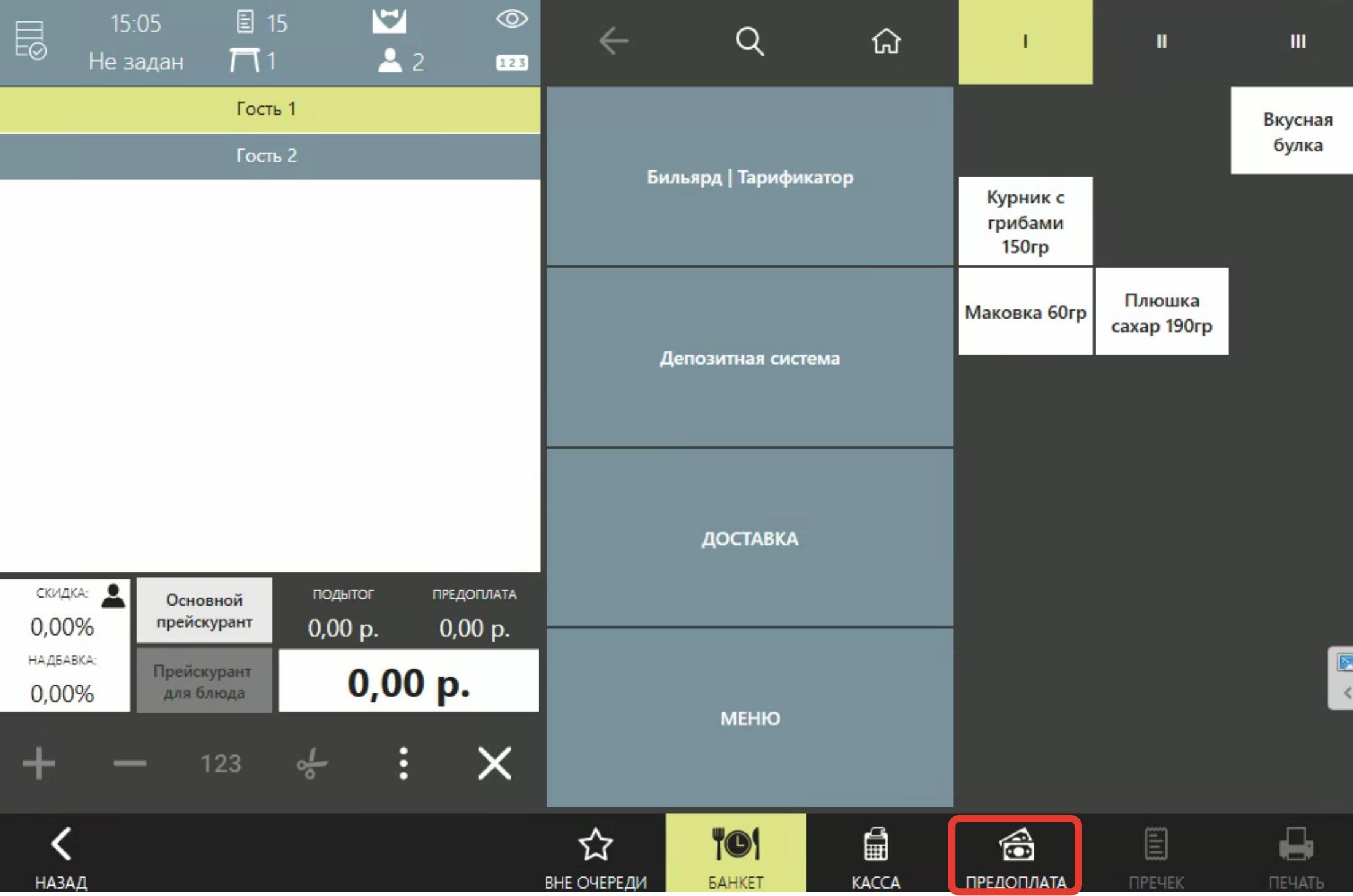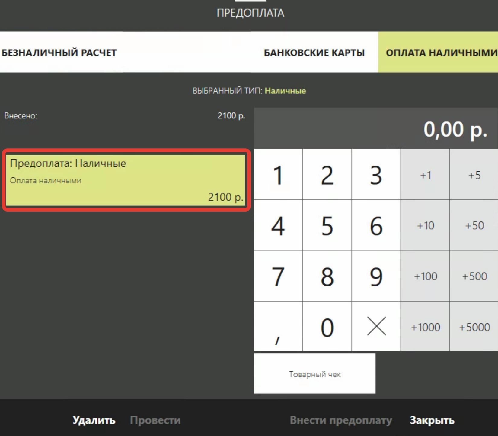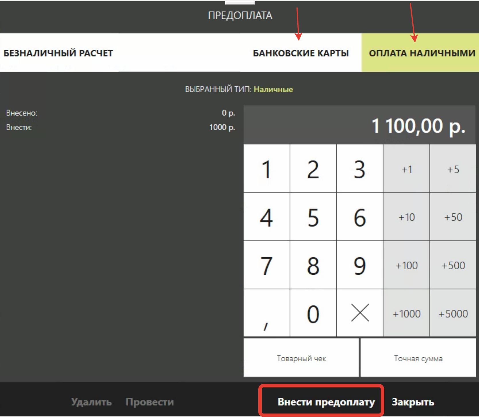 В открывшемся окне выберите Способ расчета, укажите Сумму и нажмите Внести предоплату