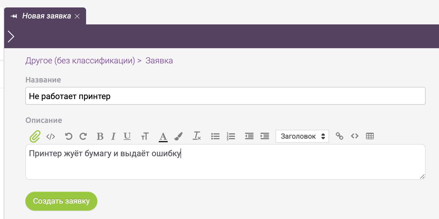 Если нужно создать новую заявку, нажмите в верхнем правом углу кнопку "Создать заявку". В открывшейся форме введите кратко тему и более подробно описание проблемы.