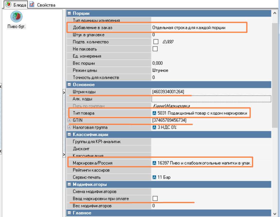 Для пива и слабоалкогольных напитков свойства карточки выглядят так: